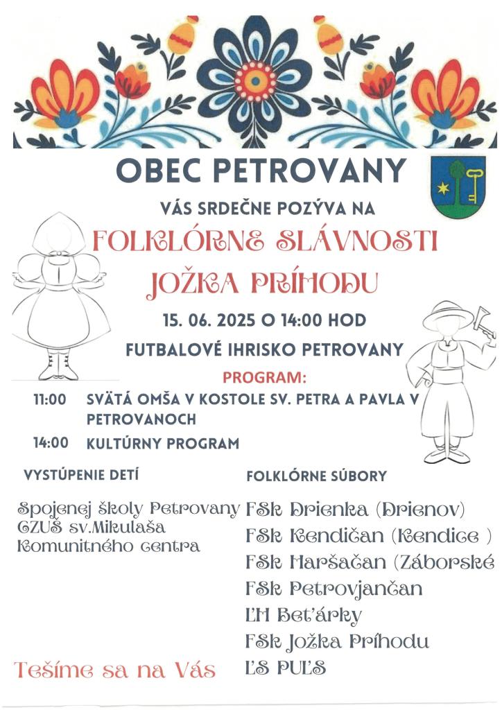 Srdečne Vás pozývame na folklórne slávnosti v obci Petrovany dňa 15.06.2025 ( nedeľa).