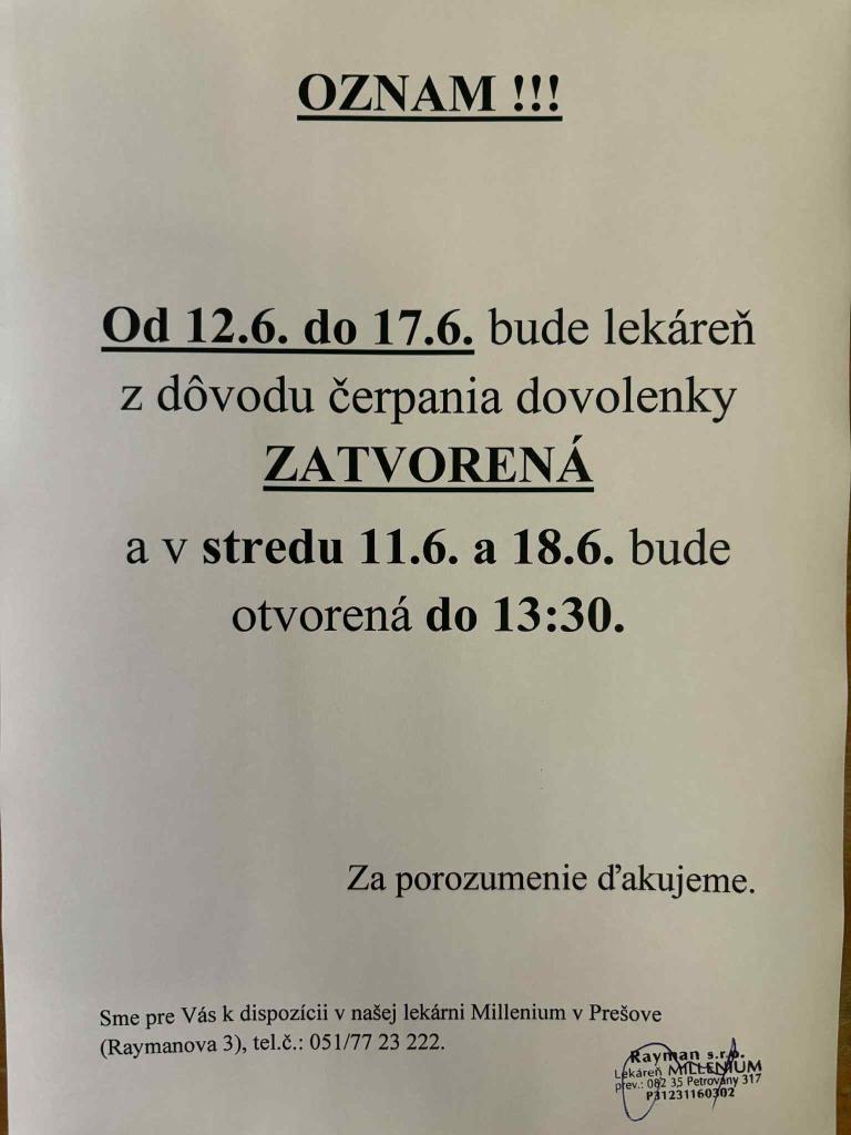 Lekáreň v Petrovanoch - dovolenka od 12.6.2025 do 17.6.2025