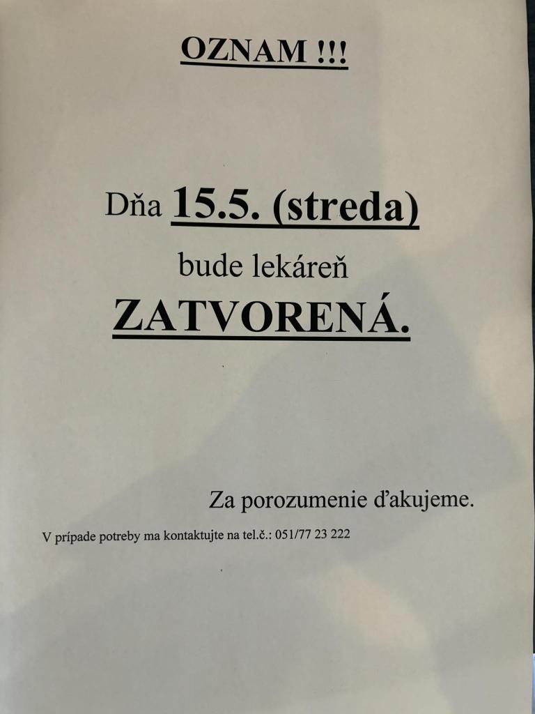 Dňa 15.5.2024 (streda) bude lekáreň zatvorená.