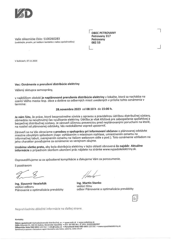 Oznam o prerušení distribúcie elektriny 28.11.2023