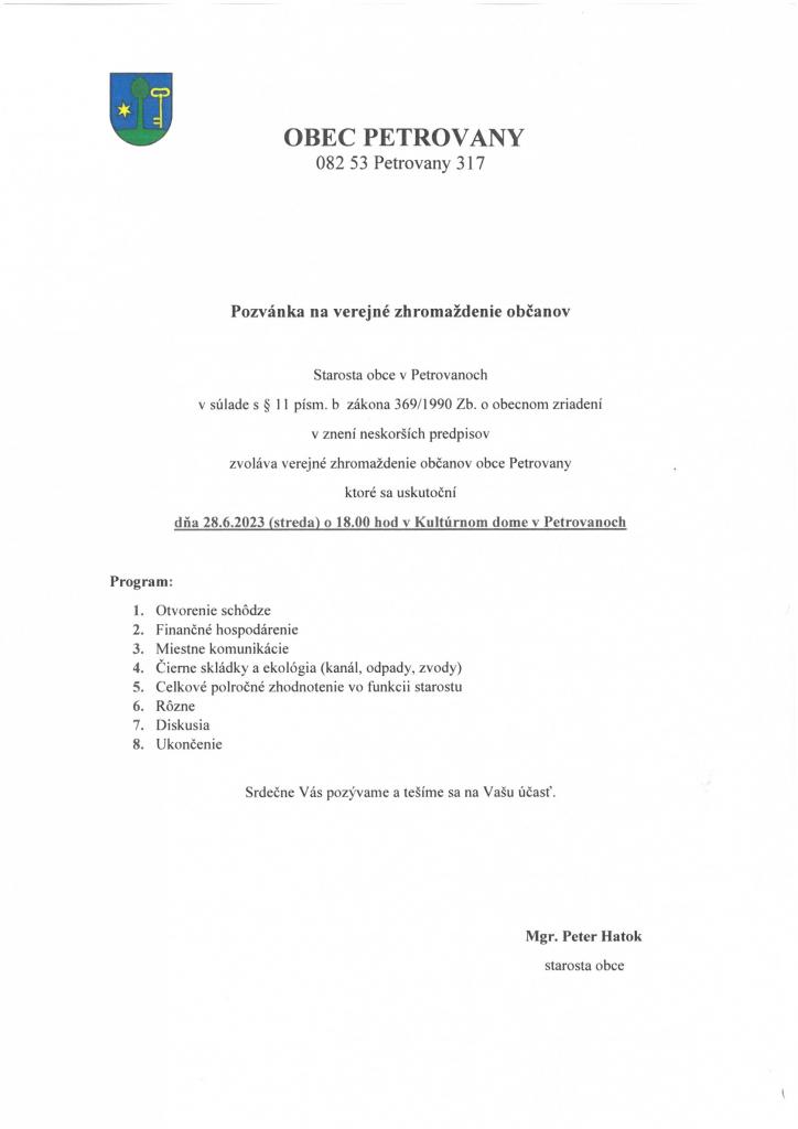 Pozvánka na Verejné zhromaždenie občanov 28.6.2023