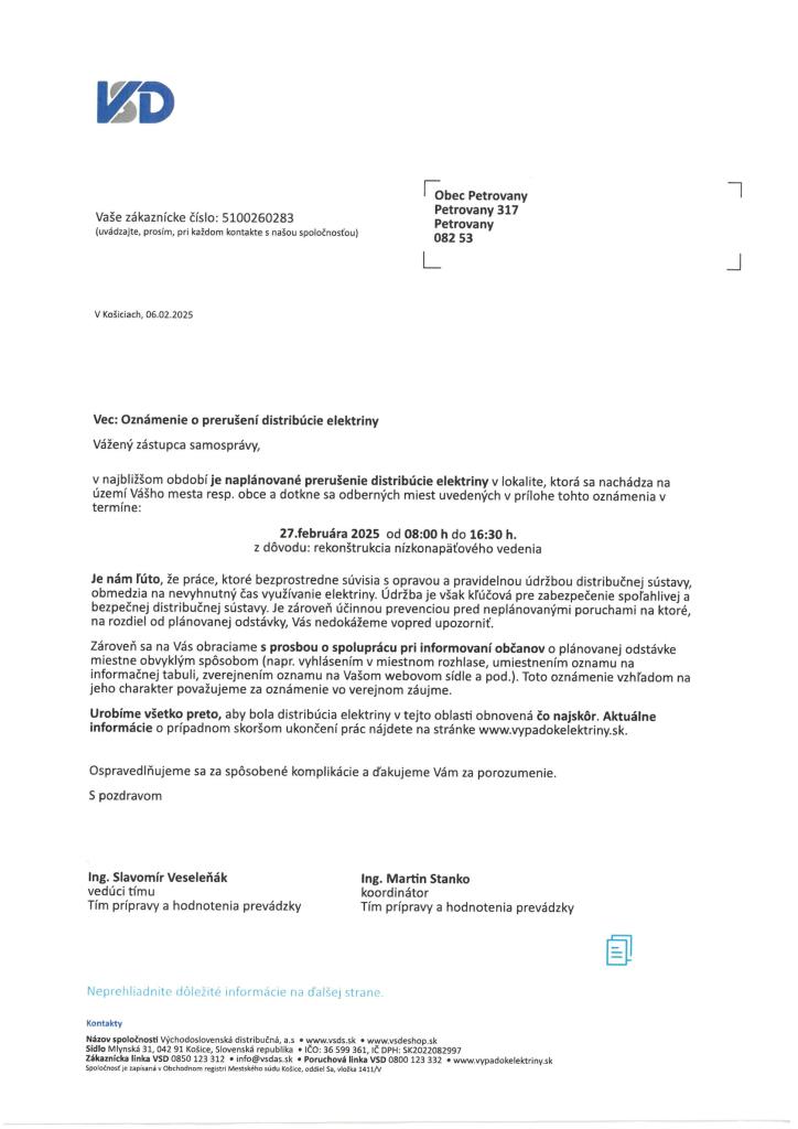 Prerušenie distribúcie elektriny 27. februára 2025 kvôli rekonštrukcii