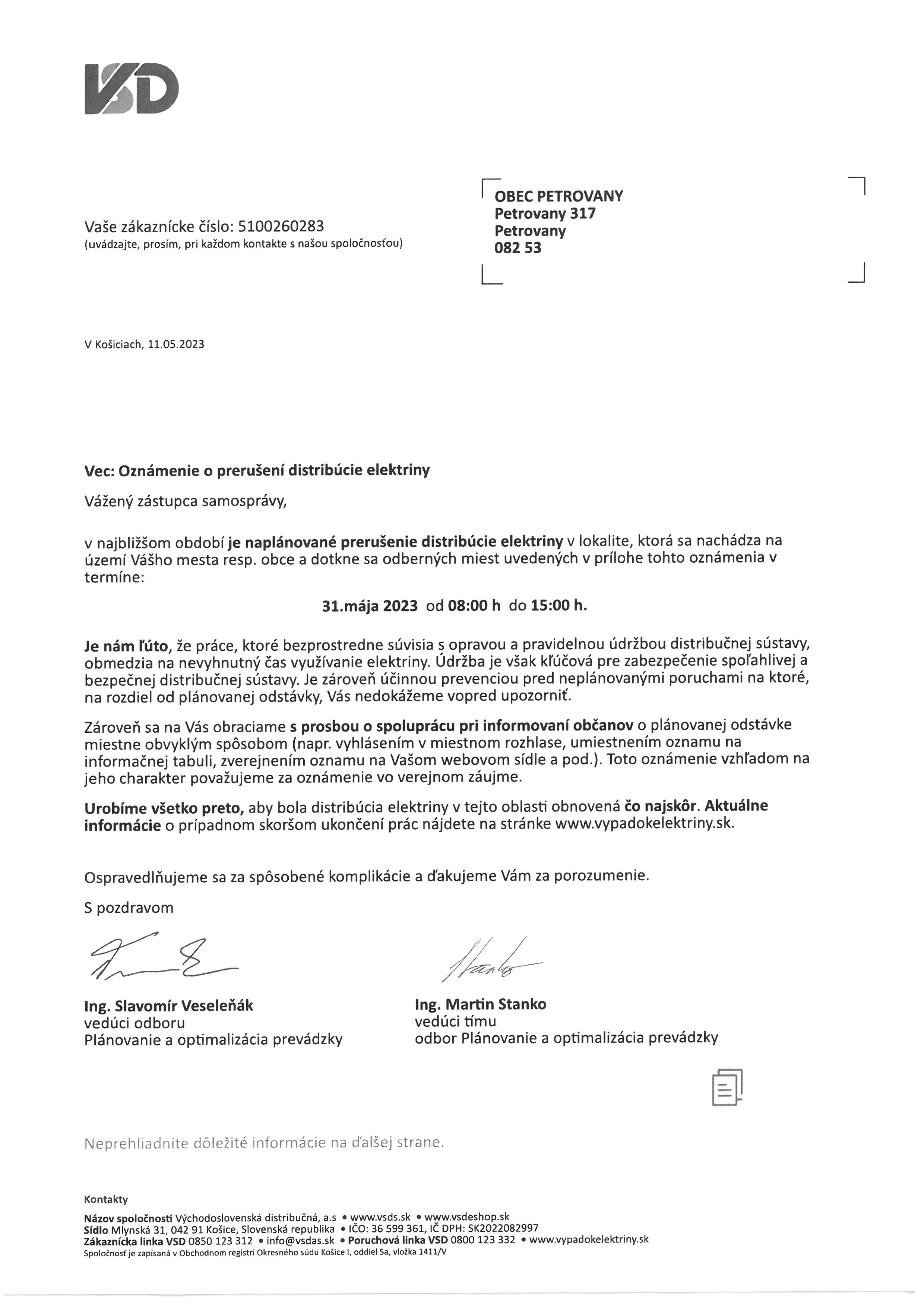 Prerušenie distribúcie elektriny 29.5.2023 a 31.5.2023