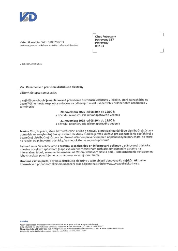 Prerušenie distribúcie elektriny vo štvrtok 20.11.2025 a v piatok 21.11.2025