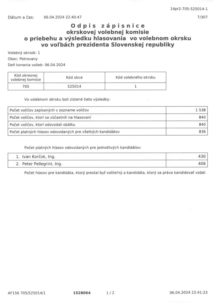 Výsledky volieb prezidenta SR v obci Petrovany - II. kolo 6.4.2024