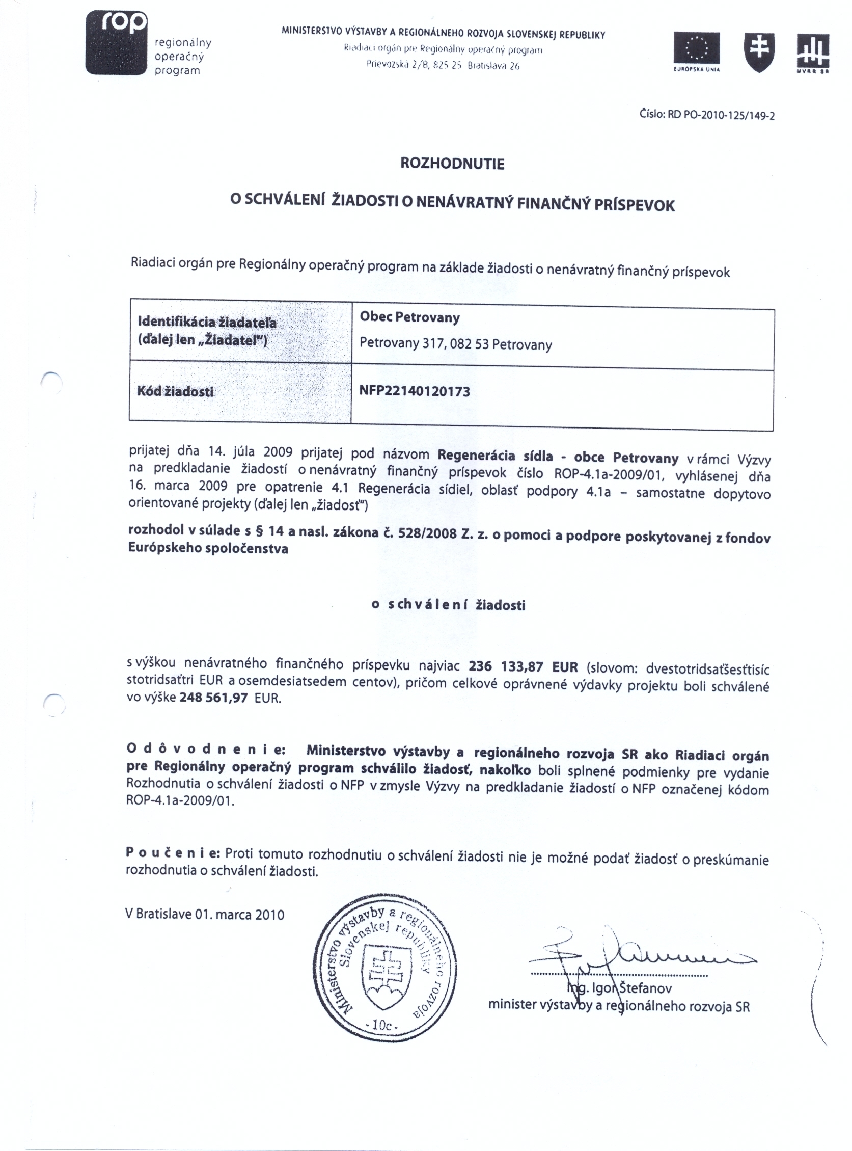 Obec Petrovany v rámci výzvy pre operačný program Zamestnanosť a sociálna inklúzia na základe žiadosti o nenávratný finančný príspevok prijatej dňa 23.12.2009 pre opatrenie 2.2 Podpora vytvárania rovnosti príležitosti v prístupe na trh práce a podpora integrácie znevýhodnených skupín na trh práce s osobitným zreteľom na marginalizované skupiny získala príspevok 159 766,89€, čo predstavuje 95% z celkových oprávnených nákladov. Zvyšok dofinancuje obec z vlastných zdrojov. Celé znenie rozhodnutia Ministersva práce, sociálnych vecí a rodiny SR Viac TU...
